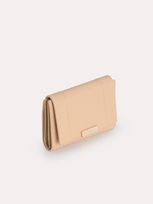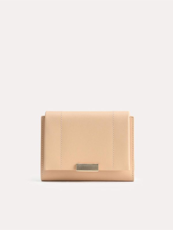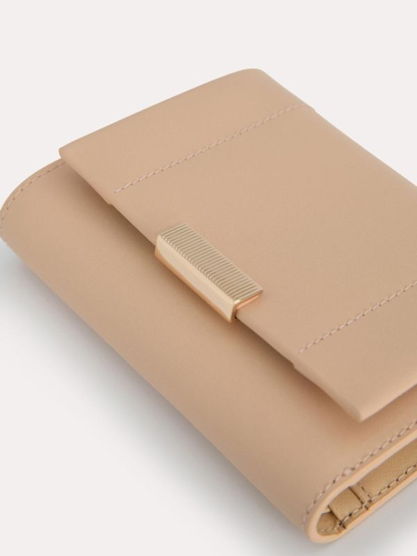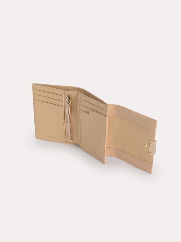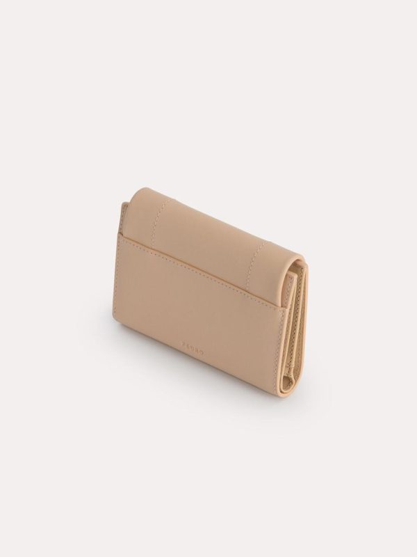 Keep your cards and money in these stylish tri-fold wallets. It is designed in a trapezoid silhouette and decorated with gold hardware that conceals the closure.